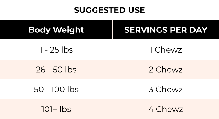 Like I said before… you can’t give your dog too many Hip+Joint NutraChewz Hip+Joint because the ingredients are water soluble. With that said, the recommendation per day is as follows.